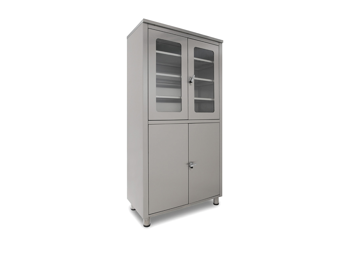 The lockable glass doors at the top allow personnel to check the materials inside without opening the door, helping to maintain sterility. The steel covered section at the bottom is ideal for materials that need to be kept enclosed. The 3 adjustable shelves inside ensure the most efficient placement of sets of different sizes. The 4 ball joint feet that firmly grip the floor perfectly maintain the cabinet’s balance.